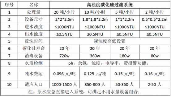 本系統采用高濁度(≤1000NTU) 原水經過自壓(0.2MPa) 壓進入過濾器,原水與瓷砂濾 料進行充分接觸攔截,瓷砂能夠截留水中大量雜質,出水濁度高于飲水標準指標,在經過0.1微 米孔徑的碳化硅過濾系統,出水濁度能達到0.5NTU 以下,若原水質特別差時,本系統還能夠 保證出水水質穩定,系統運行達到設定值時,自動啟動設備切換進行反沖洗,無人值守自 動控制系統自動如此往復運行,保證飲水指標,達到安全供水。